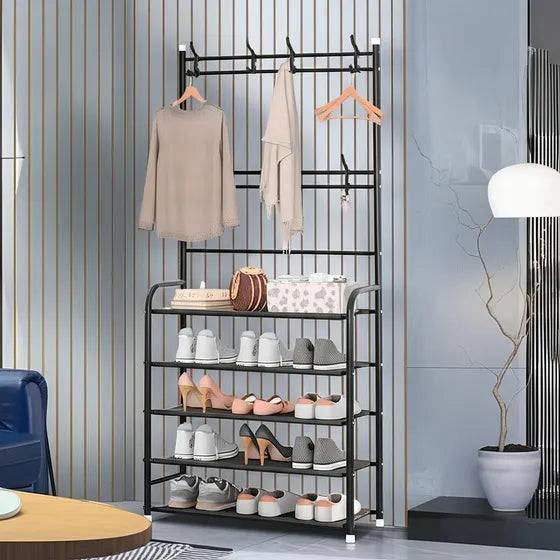 Presentamos el Zapatero Perchero Organizador de 5 Niveles, la solución compacta y elegante que su casa necesita para conquistar el desorden del día a día. Ya sea en la entrada, en un dormitorio o en el vestidor, este organizador multifuncional maximiza cada centímetro de espacio.